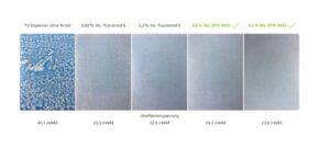 Wetting is closely linked to flow and surface tension. While fluorosurfactants affect surface tension, they often have minimal impact on spreading. Thus, direct wetting behaviour should be assessed when replacing additives. Fig. 3 shows a PU dispersion without surfactant failing to wet PU leather. A 0.02% fluorosurfactant improves this but remains suboptimal. At 0.2%, the result is much better. This effect can be matched using fluorine-free polyether-modified polysiloxanes. Here, a fluorosurfactant must lower surface tension to 22.9 mN/m, while the silicone surfactant achieves similar wetting at 29.2 mN/m. For difficult substrates, the dosage may need adjustment.