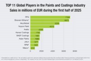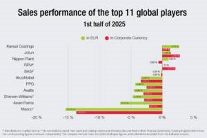 The TOP 11 global paint and coatings players reported a 2% revenue decline in EUR terms in the first half of 2025. In line with the global economic trend, the second quarter showed weaker performance for most companies compared with the first quarter.